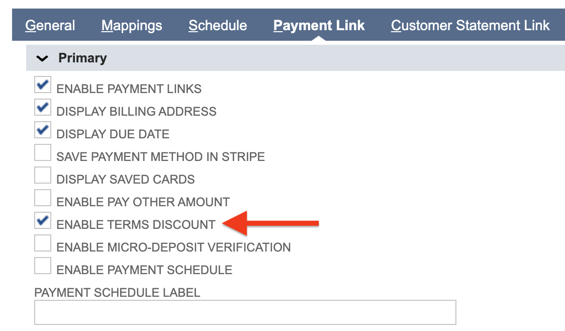 To offer terms discount on the payment link, select the checkbox for Enable Terms Discount.
