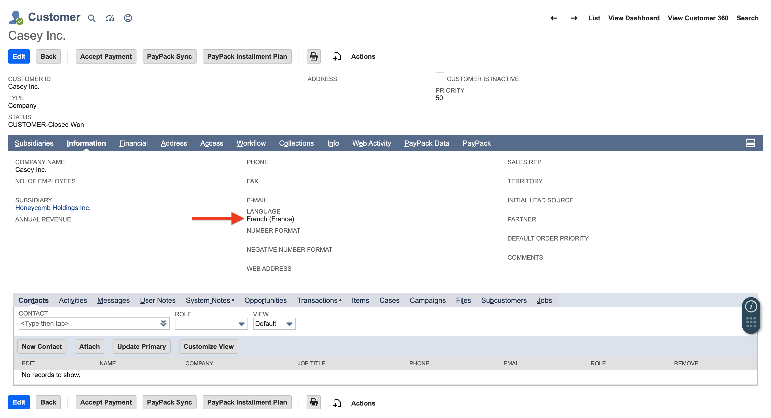 If a NetSuite Customer's language is set to anything other than English, the PayPack Payment Link will display the appropriate translation.