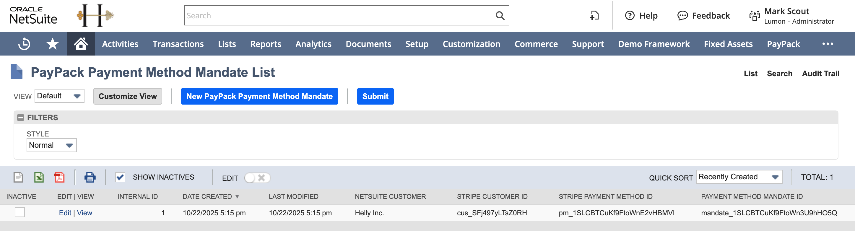 To view a list of PayPack Payment Method Mandates, use the NetSuite global search for page: PayPack Payment Method Mandate List.