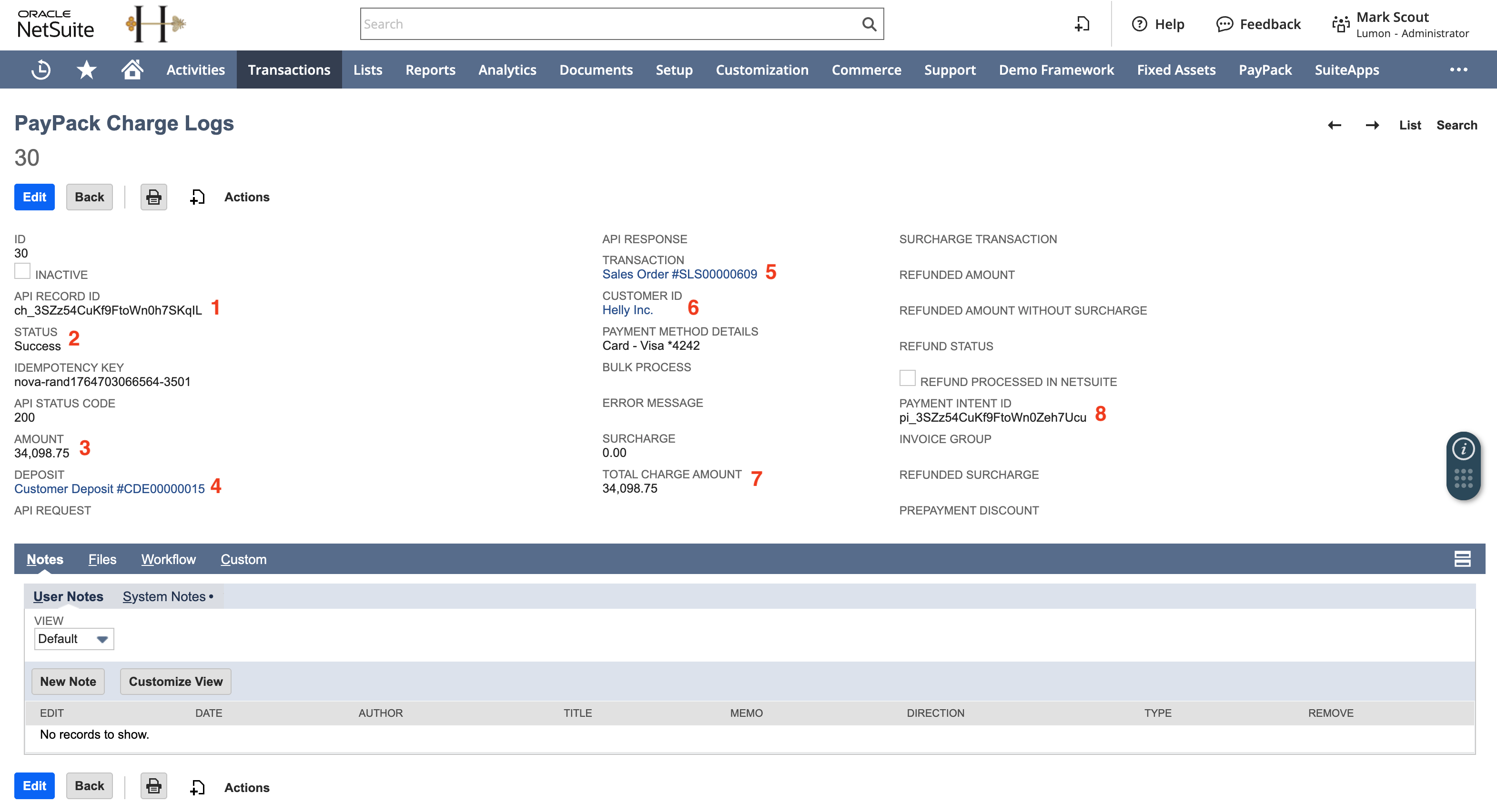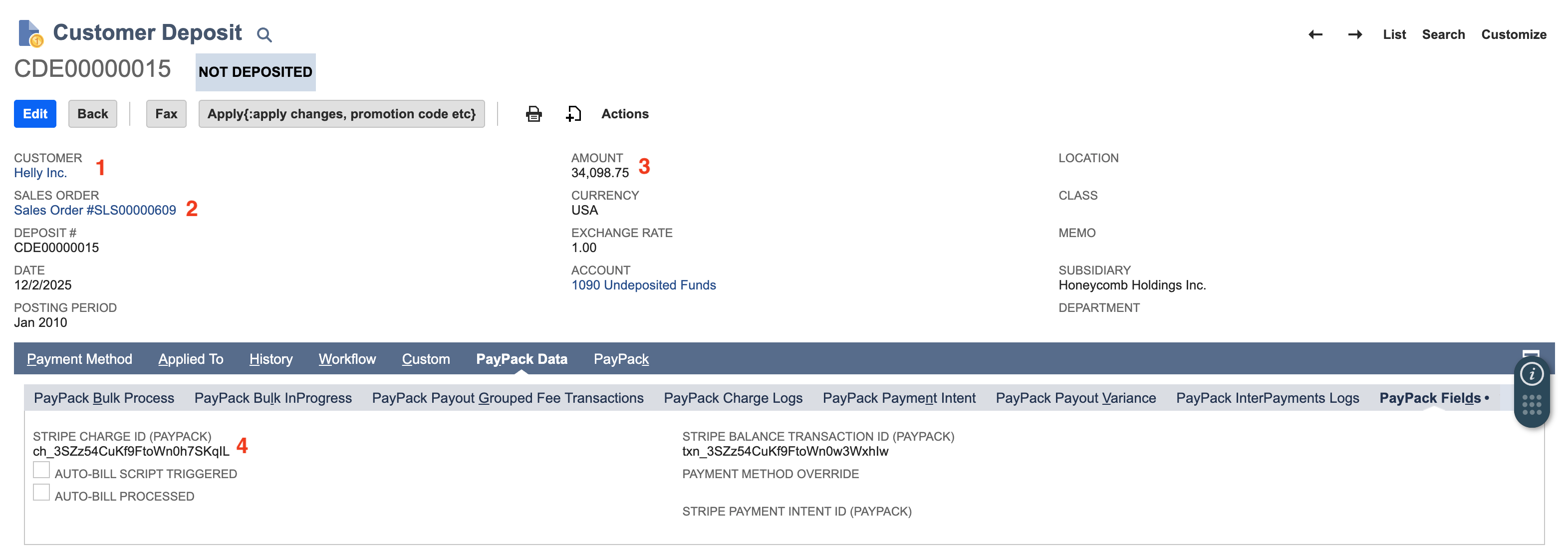 NetSuite Customer Deposit: The successful PayPack Charge Log automatically triggers the creation of the NetSuite Customer Deposit record. This record is essential as it includes the Stripe Charge ID - stored in a custom field named Stripe Charge ID (PAYPACK).